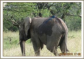 It took twelve minutes for the drugs to take full effect. In the meantime the elephant was being pushed into the open and prevented from returning to the thicket. He assumed right lateral recumbence.