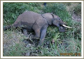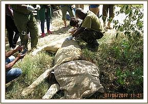 This elephant appeared not to have moved as soon as he was injured but fell down on the spot. This was a grave prognosis and there was no way this elephant could have survived with this.