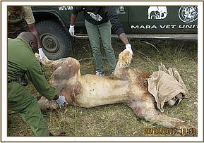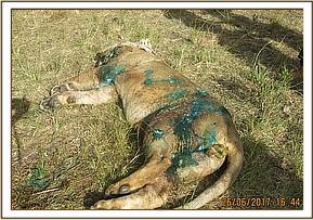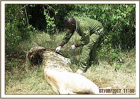 This lion had suffered severe injuries as a result of the fights. It appeared he had been attacked by several other lions with injuries inflicted on almost every part of his body and he had lost a lot of blood. The Injury of concern was a spinal injury at the lumbar region which rendered him almost immobile. Treatment involved debriding all the wounds of necrotic tissues, rinsing with clean water and disinfecting with tincture of iodine. Additional treatments included infusion with Cloxacillin ointment and topical Oxytetracycline spray application.