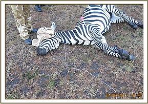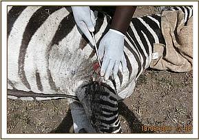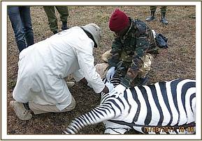 Immobilization was achieved by use of a combination of 5mgs Etorphine and 50mgs Azaperone delivered through a 1.5ml dan-inject dart from a vehicle. The zebra was fully anaesthetized after seven minutes. The plain wire was removed and further examination revealed no injury had been caused and this zebra was reversed.