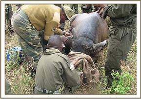 The animal was then ear-notched with a predetermined notch pattern, then biological samples such as tissue, blood, feacal and skin scrapings collected and preserved for analysis. Other treatments to the rhinos included administration of antibiotics, eye ointments, ecto-pour for ectoparasites and antibiotic spray of the ear-notch wounds.