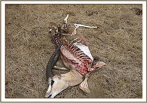 The first carcass was that of a male Grant gazelle at a GPS location of S- 00.30.986, E- 036.11.241, the carcass had been preyed on and only skeletal tissues were found. This animal could have died of fight wounds probably while fighting for females. No any other case of grant gazelle death was found hence this was an isolated case not likely to be an infectious condition.