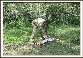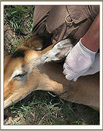 The impala was captured by darting using 5mgs of etorphine hydrochloride combined with 20mgs of xylazine hydrochloride. The drug took effect after about 10 minutes and the animal went down. It was then revived from anaesthesia immediately and then physically restrained by hands; this helped to minimize the effects of anesthetics on the physiology of the impala.
