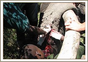 After treatment, the elephant was revived from anaesthesia using 48mgs of diprenorphine hydrochloride administered through the superficial ear-vein.