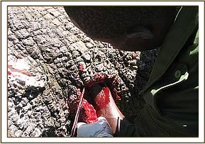The elephant was darted from a vehicle using 16mgs of etorphine Hcl combined with 2500 i.u on the right thigh. The drug took effect after about 6 minutes and it became recumbent. The wound was then examined for the presence of any foreign material but there was none, it was then pressed and cut open to drain all the pus and necrotic debris completely. The wound was later cleaned with a lot of water and gauze swabs removing all the pus and loose necrotic tissue debris. It was also probed using long tissue forceps in an attempt to find out how deep it penetrated into the tissues.