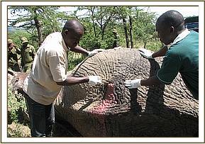 Treatment of a wounded male elephant in Naiboshio conservancy in Masai Mara.