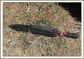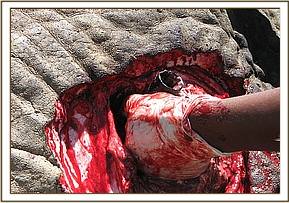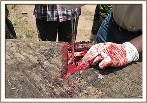 The elephant was darted from a vehicle using 17mgs of etorphine Hcl combined with 3000 i.u on the right thigh. The drug took effect after about 5 minutes and it went down. The wound was then examined for the presence of any foreign object, it was then pressed and cut open to drain all the pus and necrotic debris completely. The wound was further probed using long tissue forceps and hands wrapped in long-sleeved gloves. It was a deep wound extending into the pelvic cavity and it had a metallic spear (2 feet long) lodged inside.