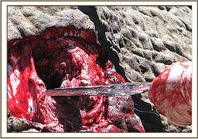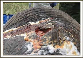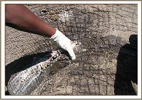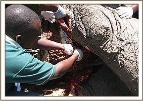 The elephant was darted from a vehicle using 17mgs of etorphine Hcl combined with 2500 i.u on the left thigh. The drug took effect after about 6 minutes and it became recumbent. The wounds were then examined pressed and cut open to drain all the pus and necrotic debris completely. The wounds were then cleaned with a lot of water and gauze swabs removing all the pus and necrotic tissues.
