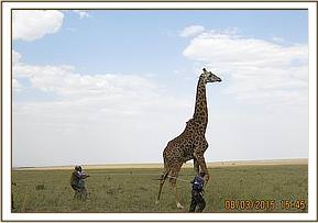 The giraffe was reversed immediately after removal of the snare by use of 36mgs Diprenorphine hydrochloride administered intravenously through the jugular. He rose immediately to join the rest of the herd waiting nearby.