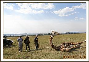 Immobilization was achieved by administration of a combination of 12mgs Etorphine hydrochloride and 50mgs Azaperone in a 3ml Dan-inject dart from a vehicle. The drugs took effect after eight minutes and the giraffe brought down with the help of ropes. He was blindfolded and made to lie on his right side for ease of examination. He was reversed immediately with 36mgs Diprenorphine hydrochloride delivered intravenously through the jugular vein.