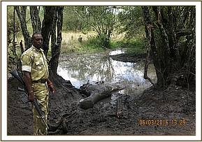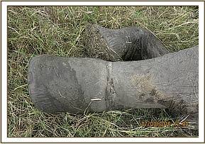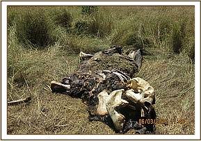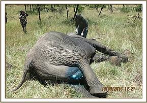 The carcass of this elephant was found the same day near Olkiombo airstrip about fifteen kilometres from the initial carcass. This was estimated to be 3 to 4 days old carcass of a young elephant whose sex could not be determined because the carcass had been extensively devoured by scavengers. Only the skull could be seen and a portion of hind limb which was partly submerged in a muddy pool. Hyenas and other scavengers had completely dismembered and stripped the carcass. As such no meaningful samples could be collected from it. Both tusks were intact and were recovered by MMNR for accounting and safe custody. Its cause of death could therefore not be determined.