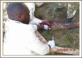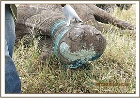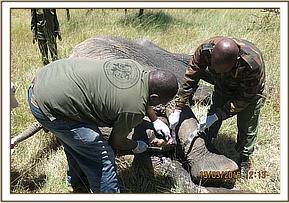 It took ten minutes for the drugs to take full effect with the elephant assuming left lateral recumbency. The calf was taken to the side to make room for the mother to be attended to. Examination revealed lacerations on the internal surface on the right side of her vulva.It is not known what caused the lacerations but could be accidental pricking by tree stumps or any sharp object after tripping. This resulted in severe inflammation with swelling that partially occluded urethral opening and interfered with micturition.