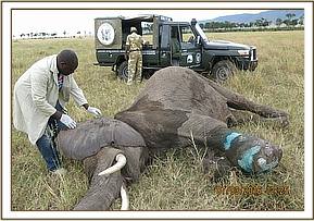 She was immobilized by use of 15mgs etorphine hydrochloride delivered in a 3ml dainject dart. Darting was done from a vehicle.