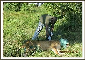 Restraint was achieved chemically by use of a combination of 5mgs medetomidine and 300mgs ketamine hydrochloride delivered in a 3ml Dan inject dart.Darting was done from a vehicle. It took eight minutes for the drugs to take full effect. This lioness was lifted out of the small thicket into an open shade for treatment. She had multiple bite wounds from other lions. All the injuries were soft tissue injuries. All the wounds were debrided with dilute hydrogen peroxide, rinsed with clean water and wiped dry with gauze swab. They were then disinfected with tincture of iodine and cloxacillin ointment infused.