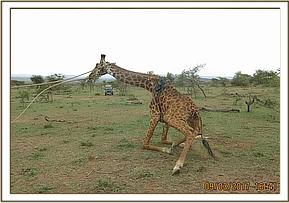 Immobilization was achieved by use of a combination of 12mgs Etorphine hydrochloride and 50mgs Azaperone delivered through a 3ml dan-inject dart from a vehicle. It took eight minutes for the drugs to take full effect whereupon he was roped down for effective restraint.