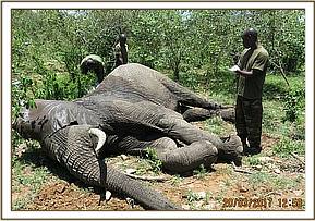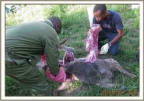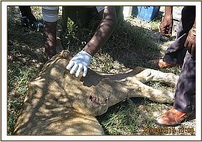 Finally he was darted and examination revealed a freshly inflicted spear wound hardly 24hours old. The wound was about 4inches deep accessing the knee joint and damaging joint cartilage. He had also suffered a long term injury on the same leg diagnosed as hip subluxation.