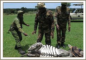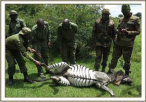 Immobilization was achieved by use of a combination of 6mgs Etorphine hydrochloride and 50mgs Azaperone delivered through a 1.5ml dan-inject dart from a vehicle. It took seven minutes for the drugs to take full effect with this zebra assuming left lateral recumbency. Since the snare was loose, it was removed without any complications and no injury on the leg was noted.