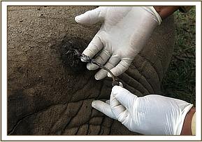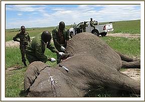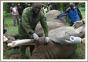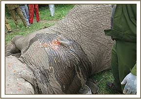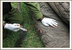 Restraint was achieved chemically by use of 15mgs Etorphine hydrochloride delivered through a 1.5ml dan-inject dart from foot. All along, the young bull was very protective of him and made several mock charges before eventually moving away. The big bull followed him before being overwhelmed by the anaesthetic ten minutes later after covering close to 500meters. After stabilizing him, a thorough examination was conducted. The barbed arrowhead was retrieved from the base of the trunk and another one was found and removed from the injured left thigh after deep probing. Both arrowheads were considered not poisoned. The wounds were thoroughly cleaned with copious amount of water and hydrogen peroxide. Tincture of Iodine was used for disinfection and Cloxacillin ointment infused.