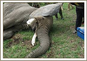 He was spotted with an arrowhead at the base of his trunk and a suppurating wound on his right hind leg by Masai Mara Reserve Rangers and Governor’s camp guides. They called the mobile veterinary unit for help. This old bull was seen near the camp in company of a very protective young bull. He appeared calm with the arrowhead clearly visible from a distance.