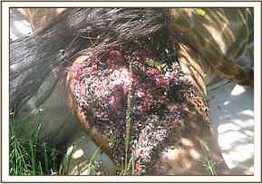 The wound was cleaned and debrided using hydrogen peroxide solution followed by an application of tincture of iodine and oxytetracycline spray. The wound was already septic and had maggots which were flushed out using water and hydrogen peroxide. Antibiotics also administered parenterally through the muscles to enhance healing process.