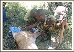 The lion was captured using 350mgs of Xylazine Hcl combined with 350mgs of Ketamine Hcl, it was darted on the right thigh and became recumbent after about 5 minutes. It was then blindfolded and transferred to a cool shade under a tree from where it was examined and treated.