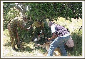 The animal was then captured by chemical immobilization through darting using 13mgs of etorphine hydrochloride combined with 30mgs of Xylazine hydrochloride. It took about 5 minutes to become narcotized then ropes were used to knock it down.