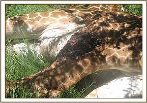 The second giraffe was found in the same herd from where the first one was treated. It was an adult female giraffe that had a severe septic wound on the corium of the right hind limb extending proximally above the hoof. It was unable to move properly and it was in a deep pain. The animal had lost much of its body condition probably due to its inability to walk, feed and take water freely. The veterinary team then decided to attend to it.