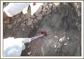 The two wounds were examined and probed using a long tissue forceps and swabs. They were cleaned using water, exudates and necrotic tissues squeezed out. Then further chemically debrided using 10% hydrogen peroxide draining all the accumulated pus and tissue debris, and later treated with a tincture of iodine and oxytetracycline spray. There was no foreign material retrieved from the wounds.