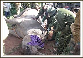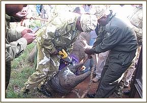 The white rhino was spotted while grazing near the rhino boma, it was positively identified as the dominant bull and darted on the left thigh using 5 mgs of etorphine Hcl combined with 80 mgs of xylazine Hcl, it took about 7 minutes for the drugs to take effect and the rhino went down on lateral position. Immediately it was down, 10mgs of Nalorphine was administered through the ear-veins to help improve the respiratory rate. It was then blindfolded and other vital parameters such as the respiratory rate, body temperature and heart rate were constantly monitored throughout the operation to ensure that the rhino was under stable anaesthesia. One of its horns was drilled and fitted with a transmitter which will help in monitoring its movements in Nairobi Park. The eyes were treated using Opticlox® ointment and dart wound sprayed using oxytetracycline spray. The ear notches were also enlarged to assist in positive identification.