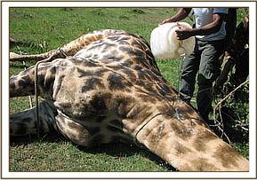 The giraffe was effectively immobilized after twelve minutes falling on his own. The snare was removed and the animal covered with 40mls of20% oxytetracycline antibiotic equivalent to 8g oxytetracycline. Since there was no physical injury caused by the snare, no topical application was needed.
