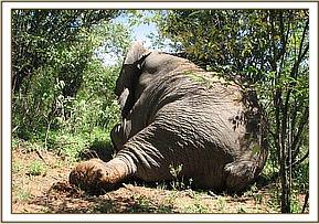 This was a case of an adult male elephant which had two small wounds on the posterior side of the left front leg. The wounds were infected but the cause of the injury was not known. The elephant was darted from a vehicle using 18mgs of etorphine Hcl combined with 1500 i.u of hyaluronidase, the drug took effect after about 10 minutes and it became recumbent.