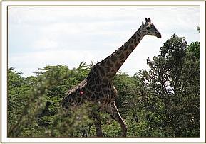 This was a case of snared giraffe. The snare was loosely hanging on its neck. It was a thick cable winch wire. The case was intervened at Mara triangle on 15th May 2011.It was a mature male.