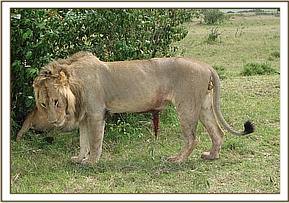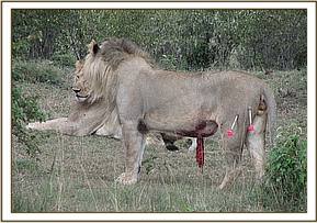 This young adult lion was injured on the night of20th May 2011 and intervention carried out on 21st May 2011, the following day. While killing an eland with other members of the pride, this lion was gored by the eland with its horns right through to the peritoneum exposing the omentum.