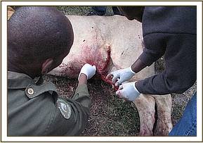 During the month of May, 2011, several cases of wildlife injuries and snaring were reported in the Mara ecosystem, these included treatment of a male elephant for traumatic injuries on the front leg, treatment of a lion with serious abdominal injury after hunting for prey, buffalo with arrow wound on the flank and a snared giraffe. Relocation of a dominant male white rhino from Ol-Choro Oiroua wildlife conservancy in Mara to Nairobi NP was done to help save other rhinos from frequent fights and also to enhance its security. Wildlife tissue samples mostly from wildebeests were also taken to Sokoine University of Agriculture (SUA) in Tanzania for culture and bacteriology to ascertain the status of bovine tuberculosis in Kenyan wildlife. Detailed reports of all the animal cases attended to during the month of May, 2011 are highlighted in the report below.