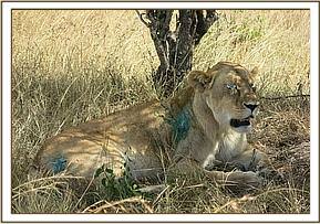 This lioness appeared to be in good health and nursing. At the time of darting, she was caressing a five month old cub. She appeared to be in pain while trying to move and this pain was emanating from her right front limb.