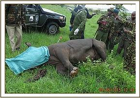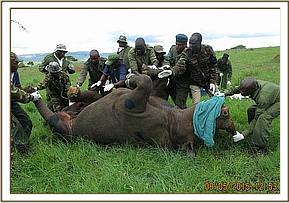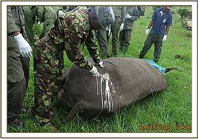This rhino was chemically restrained by use of a combination of 4.5mgs Etorphine Hydrochloride and 60mgs Azaperone Tartarate in a 3ml Daninject dart. Because of the condition of the terrain, darting was done from foot but the team was careful not to agitate this rhino. He dashed out of the thicket as soon as he was darted and ran downhill to an open area. He had an obvious limp on his right hind leg. He was overwhelmed by anesthetics seven minutes after darting and went down on his right lateral side.