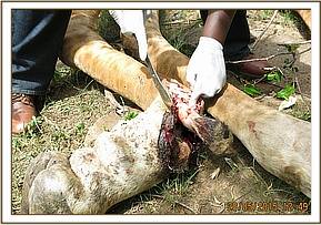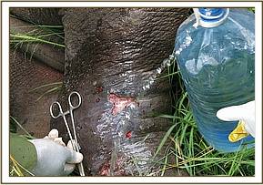 Examination revealed a swollen right hock joint with no evidence of fracture. A deep penetrating wound was also found on his left rump with no consequence on the mobility and functions of this limb. He was then flipped over to check the other side of this limb. This revealed shallow abrasion wounds at the joint most likely caused by stepping on sharp rocks when the rhino was in flight. This could have caused spraining of the joint.