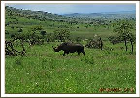 This male rhino was seen by the Mara Reserve and Serengeti Park rangers while on their joint patrols limping on his right hindlimb.He had Kenyan notches and was positively identified as having been a candidate ear notched in Masai Mara National reserve earlier. Both teams contacted their respective wardens who agreed the rhino should be treated and immediately sought the Mobile Vet’s services. By the time they contacted the team, the rhino had moved onto the Serengeti side of the border but with close monitoring by rangers from both sides. Guided by the rangers this rhino was found in a small thicket on a rocky hill. He appeared to be in fairly good body condition.