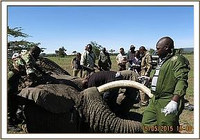 An adult male was collared in Siana, Olarro conservancy border and a female in Olkinyei conservancy. Both candidates were darted from the air using the Daninject darting system with appropriate Etorphine doses for each case. As soon as the elephants were down, all vital parameters were confirmed to be within range and overall body condition and soundness of elephant ascertained. The elephants were stabilized and then collars deployed.
