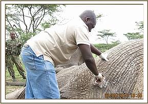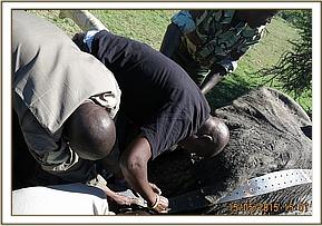 He was immobilized by use of 14mgs Etorphine Hydrochloride delivered in a 3ml Daninject dart from a vehicle. It took seven minutes for the drugs to take full effect with the elephant going down on his left lateral side. Since the wound was on the left side, he was flipped over so as to access the injury. Examination revealed a septic wound with abdominal organs bulging confirming presence of hernia. There was a small sinus discharging purulent stuff from the peritonial cavity. This indicated the elephant had indeed contracted purulent peritonitis with grave prognosis. He had a body score of 2 out of 5 with 5 being good and 1 poor. He also appeared severely anaemic.