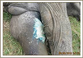She was found lagging behind the other members of the herd browsing lethargically and had lost condition. Her left front leg was swollen with a wound visible to the inner surface of her left arm near the elbow joint. Even with agitation, she was hesitant to move and when she tried she did so with a lot of difficulty and was obviously in a lot of pain.
