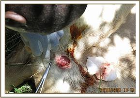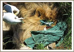 After making sure she was stable, examination revealed several bite wounds to her right thigh, and a deep one between her hind legs most likely inflicted by other lions after a fight. The deeper wound was bleeding and required some stitches after thoroughly debriding. Chromic catgut absorbable suture was used to stop the bleeding and to put in place subcutaneous suture to obliterate dead space. Tincture of iodine was then applied. The other wounds were wiped with sterile gauze swab and irrigated with tincture of iodine. Additionally Cloxacillin ointment was infused into all the wounds.