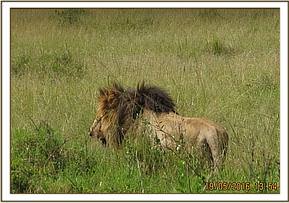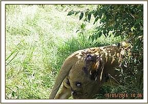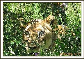 This lioness had taken refuge in a bushy part of the boma and was out of sight from everyone. The bush was thick.