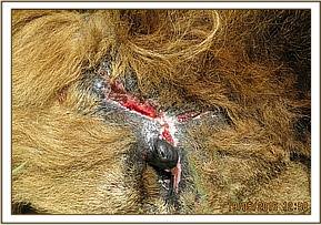 She was found in the company of another female thought to be her sister and four cubs which she was nursing. They were all under some small shrubs, sheltering from the sun. When agitated to stand, she did so with difficulty and several bite wounds to her right thigh and a deep wound between her hind legs were visible.