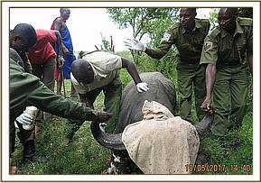 Restraint was achieved chemically by use of a combination of 7mgs Etorphine hydrochloride and 60mgs Azaperone delivered through a 1.5ml dan-inject dart. Darting was done from a vehicle and it took ten minutes for the drugs to take full effect with this big bull assuming sternal recumbency. After stabilizing him, examination was conducted which revealed a deep spear wound to the proximal anterior right front limb. The spear had split the muscles and the wound was infected.
