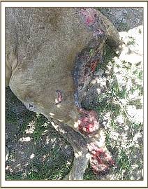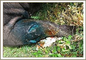 All the wounds were cleaned with Hydrogen peroxide and rinsed copiously with water.Tinture of iodine was applied as a disinfectant with Cloxacillin antibiotic ointment being infused to counter any sepsis for the deeper wounds. Oxytetracycline spray was then applied topically. Additional treatments included parenteral administration of 3000mgs Amoxicillin antibiotic and 750mgs Flunixin meglumine anti-inflammatories.