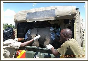 This baby elephant was seen with his mother, limping severely by Mara Triangle Conservancy Rangers. They also noticed part of his tail was missing. They called the mobile veterinary unit for assessment.
