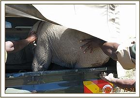 Immobilization was achieved by use of 14mgs Etorphine hydrochloride delivered through a 1.5ml Dan-inject dart from a vehicle. He was fully narcotized after eight minutes and fell on his left lateral side. Examination revealed a moderately swollen right carpal joint without any visible injury. Aspiration yielded nothing unusual. It was suspected he suffered a sprain of this joint and support treatment was provided to hasten healing.