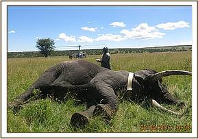 This bull elephant, christened Mytene, was collared in 2013 in the Masai Mara National Reserve in a joint activity between KWS and Mara Elephant Project for monitoring purposes. Since then he has been moving between the Masai Mara National Reserve and Serengeti National Park. His tracking collar was expiring and there was a need to remove it while the signal could still be tracked otherwise locating him would prove a challenge. This activity was conducted by the KWS and Mara Elephant Project in collaboration with Serengeti National Reserve Management. Mytene was located within the park in a large herd of elephants.