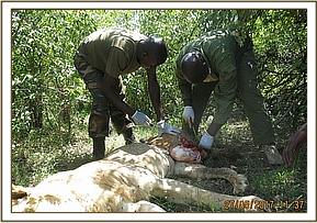 After careful assessment, prognosis of this lion was considered grave, especially in the wild, and the suffering he was going through which was agonizing. The team decided to euthanize the lion to end his suffering and this was effectively done by intravenous administration of 20% Pentobarbitone sodium. Post mortem was immediately conducted and confirmed the extensive damage and sepsis on the affected limb were beyond remedy.